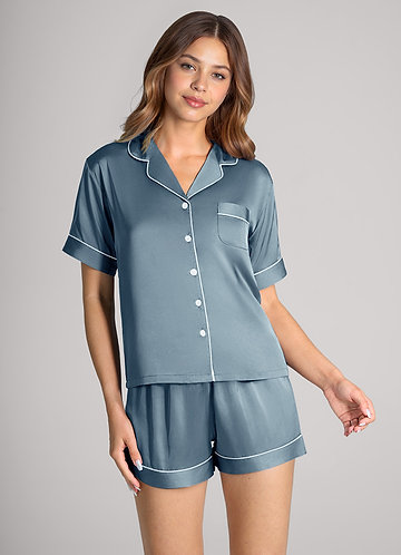 Dusty Blue Satin Contrast Piping Pajama Set