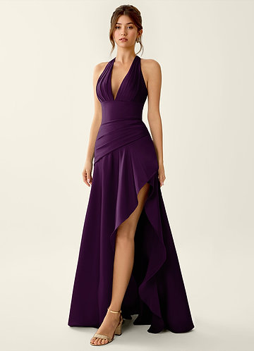 azazie Titania Grape Satin V-neck Ruffled Prom Dress