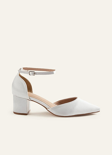 azazie Satin Pearl and Bow Pointed Toe Block Heels