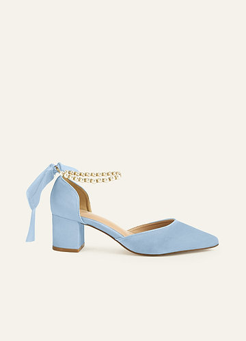 azazie Matching Color Matte Satin Pearl and Bow Pointed Toe Block Heels