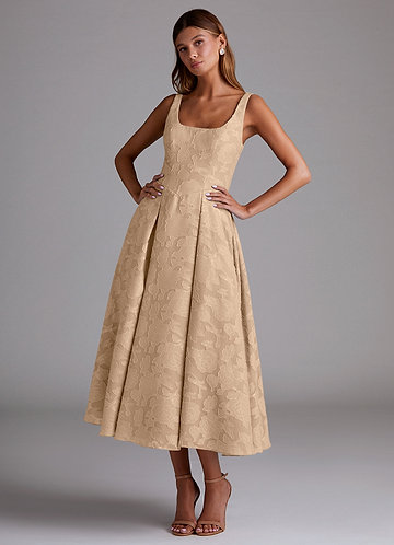 Champagne A-Line Pleated Floral Burnout Dress