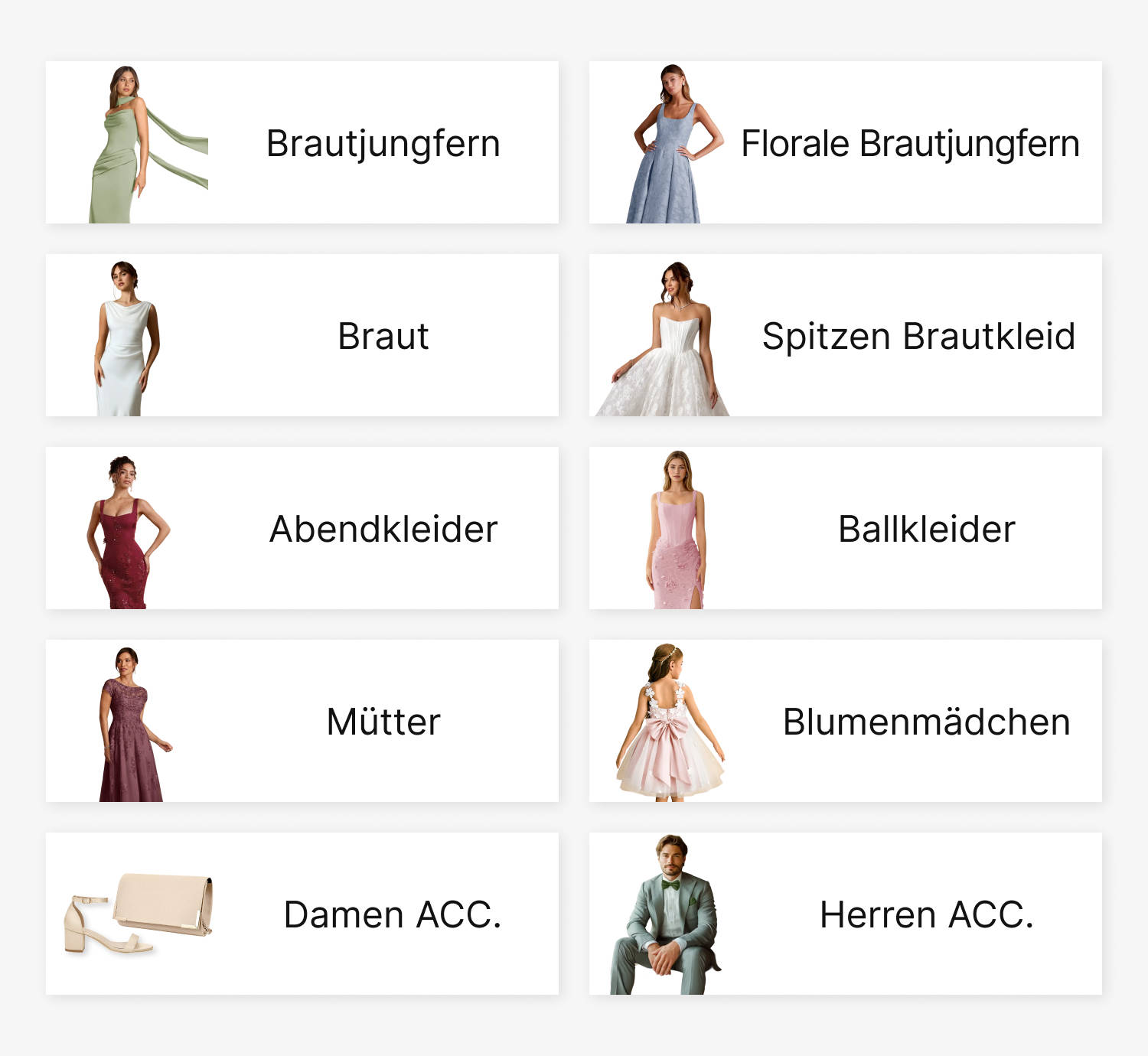 Die ganz besonderen Damen in Ihrem Leben verdienen ein wunderschönes Kleid mit der perfekten Passform, das den Stil Iherer Hochzeit zu verstärkern. Mit Hunderten von Farben und Silhouetten zur Auswahl finden Sie ein Kleid, das nicht nur zu Ihrem Thema, sondern auch zu ihrem Budget passt.