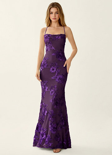 azazie Kailani Ciruela Vestido de fiesta de sirena con corsé de flores 3D y espalda con cordones
