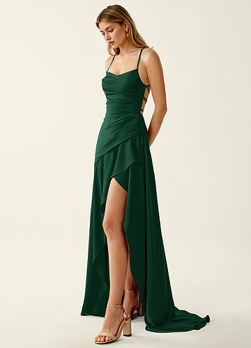 azazie Annabella Rose Verde Esmeralda Vestido de fiesta de satén con espalda de encaje