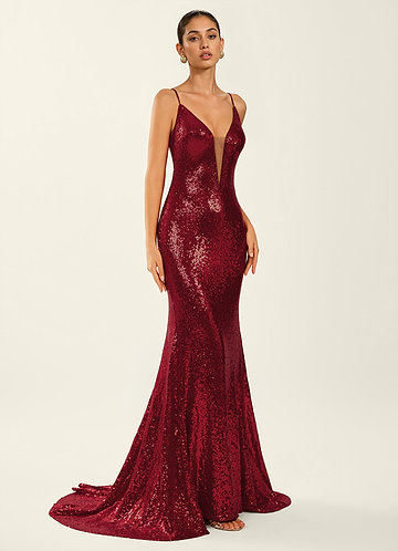 azazie Astraea Borgoña Vestido de fiesta de sirena con escote en V brillante y espalda descubierta
