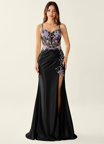 azazie Kailani Noir Robe de bal sirène corset à fleurs 3D et laçage au dos
