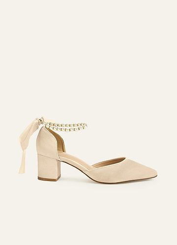 Escarpins à bout pointu en satin mat de couleur assortie avec perles et nœud