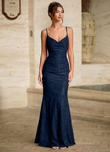 azazie Leahenmo Navy Textured Floral Jacquard Prom Dress