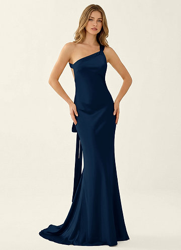 azazie Leahenmo Navy Textured Floral Jacquard Prom Dress