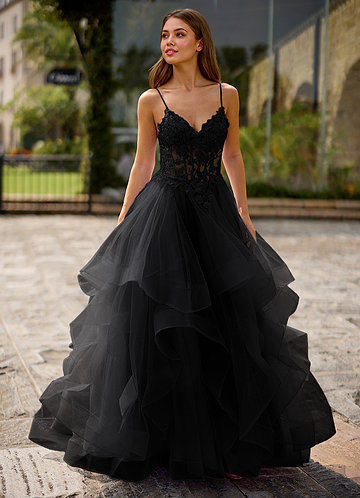 azazie Belinda Preto Vestido de baile sereia com espartilho e amarração nas costas com flores 3D