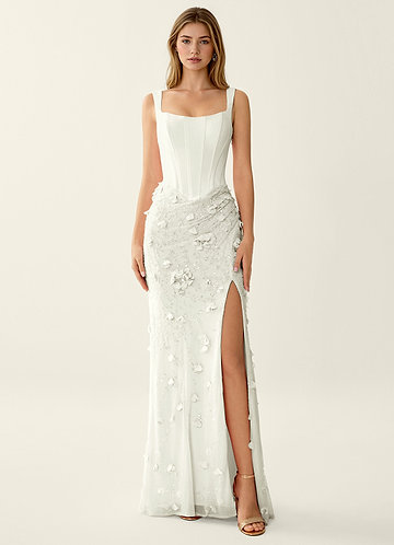 azazie Kailani Branco Vestido de baile sereia com espartilho de flores 3D e fechamento em cadarço nas costas