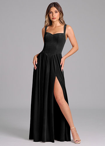 Vestido Preto de Veludo de Linha A com Fenda Lateral