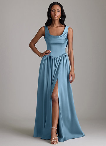Vestido Aço Azul de Cetim elástico de Linha A com com bolsos