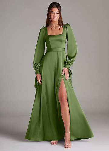 Vestido Zimbro de Cetim elástico de Linha A com Manga comprida