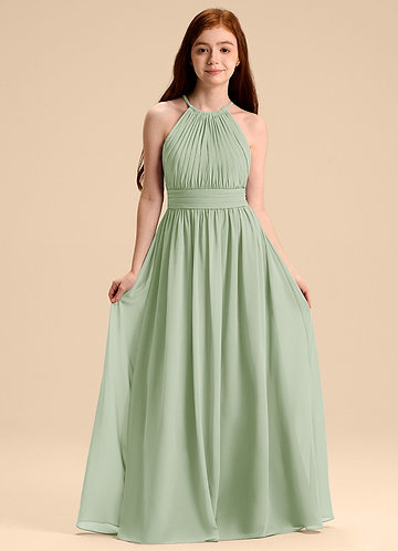 Vestido Dusty Sage de Chiffon de Linha A com Plissado