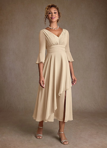 Vestido Champanhe de Chiffon de Linha A com Plissado