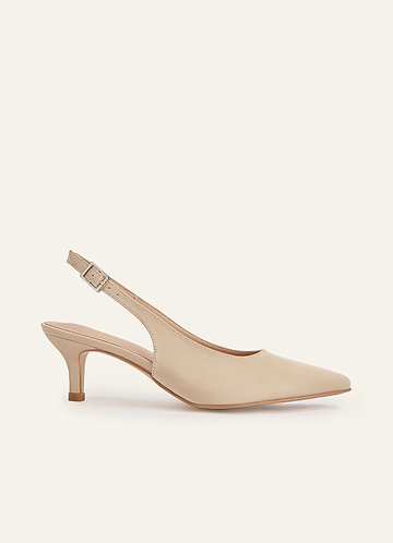 Sapato de salto baixo com bico fino e tira no calcanhar, em cetim fosco na mesma cor.