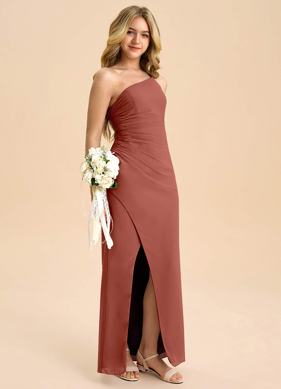 Vestido Castanho Aloirado de Chiffon de Linha A com Plissado